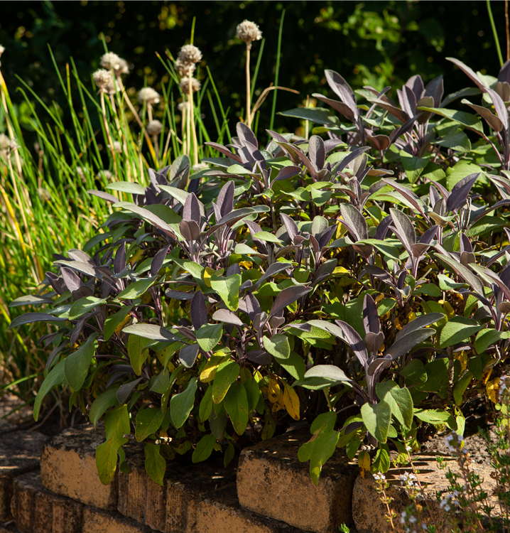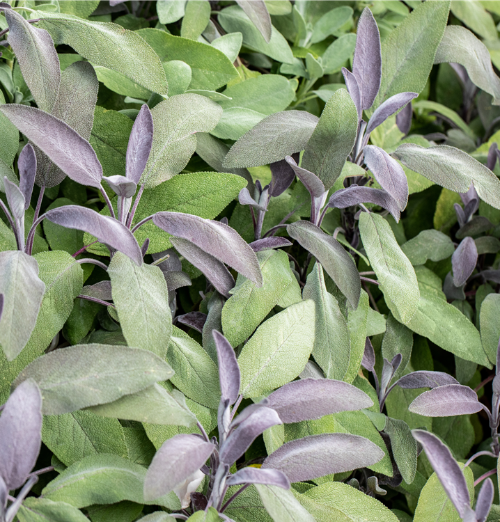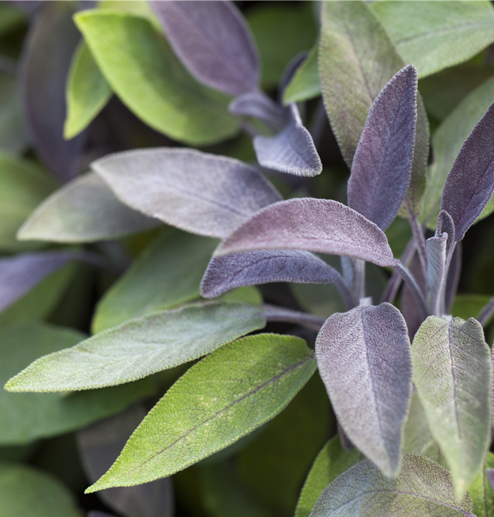 • Die wintergrünen Blätter des Garten-Salbeis 'Purpurea' sind violett, lanzettlich, behaart