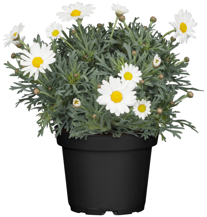 Die Strauchmargerite (Argyranthemum frutescens) ist eine beliebte Pflanze für den Balkon, die März bis August unzählige weiße, gelbe, rote oder rosafarbene Blüten bildet. Die mittelgrünen Blätter sind gefiedert. Ein sonniger Standort und ein durchlässiges Substrat werden bevorzugt.