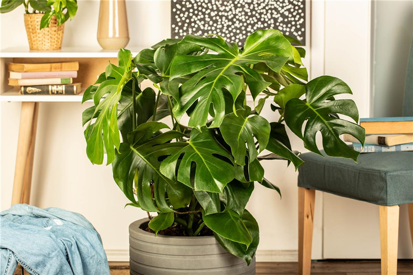 Unangefochten auf Platz 1 der besten Pflanzen fürs Homeoffice ist das Fensterblatt, auch als Spathiphyllum bekannt. Das Fensterblatt ist eine besonders pflegeleichte Zimmerpflanze und kommt auch mit dunklen Ecken im Haus zurecht. Als perfekte Pflanze fürs Homeoffice reinigt sie die Raumluft und filtert Schadstoffe hinaus. Vor allem Benzol, das durch Drucker entsteht und die sind ja vor allem im heimischen Büro zu finden. Außerdem reichert die Pflanze die Luft deutlich mit Sauerstoff an und hat ganz nebenbei auch noch hübsche weiße Blüten zu bieten. Ebenfalls für schattig Stellen geeignet ist unter den Pflanzen fürs Homeoffice der Gummibaum. An einem dunklen Fleck braucht er zwar weniger Wasser, punktet aber auch mit seinen Eigenschaften. Die Pflanze reinigt ebenfalls die Raumluft und reichert sie mit Sauerstoff an. Und eine absolute Trendpflanze darf unter den Top 3 natürlich nicht fehlen. Die Monstera ist eine der beliebtesten Pflanzen fürs Homeoffice. Trotz ihrer exotischen Herkunft ist sie besonders anspruchslos und pflegeleicht und bedankt sich mit einzigartigen Blättern, die uns guttun. Die Monstera gehört ebenfalls zu den luftreinigenden Pflanzen und steigert die Qualität der Raumluft enorm. Sie ist gut für das Raumklima und sind ein guter Sauerstoffspender. Außerdem sorgen die großen Blätter für Ruhe und wirken harmonisch.