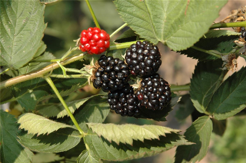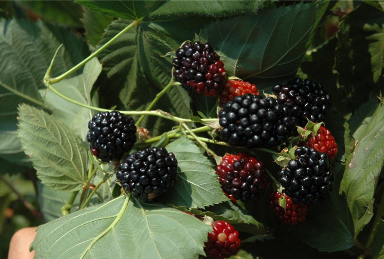 Seitentriebe, an denen im Vorjahr Brombeeren wuchsen, sollten entfernt werden. Denn sie tragen nur einmal, sterben dann ab und machen damit Platz für neue Triebe, an denen dann neue Früchte wachsen. Sind die Früchte vollreif, lassen sie sich leicht vom Strauch lösen, sind gänzlich schwarz und schmecken fruchtig-süß.