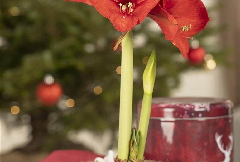 Amaryllis im Topf können Sie leicht zum Blühen bringen. Sorgen Sie für eine ausreichende Drainage und pflanzen Sie die Zwiebel so, dass sie ein Drittel über den Boden herausragt. Gießen Sie zu Beginn nur wenig und möglichst nicht direkt auf die Zwiebel. Sobald sie austreibt, braucht die Amaryllis mehr Wasser. Ihre Blüte hält die Blumenzwiebel länger, wenn sie kalt steht. Als Trockenzwiebel brauchen Amaryllis und Herbstzeitlose kein Wasser und keine Erde. Sie haben so viel Energie in ihrer Zwiebel, dass sie einfach so aufblühen. Legen Sie sie auf eine Schale mit Moos oder Steinen und sorgen Sie so für einen Überraschungseffekt auf der Fensterbank! Auch im Wasserglas kann man Amaryllis ziehen. Sehr bekannt sind hierfür auch Hyazinthen. Diese legen Sie in ein so genanntes Hyazinthenglas. Dessen besondere Form sorgt dafür, dass die Zwiebel knapp über dem Wasser aufliegt, aber nicht darin versinkt. So können die Wurzeln dem Wasser entgegenwachsen und wenn sich die Blütenknospe vollständig entwickelt hat, löst die Hyazinthe im Wohnzimmer Frühlingsgefühle aus!