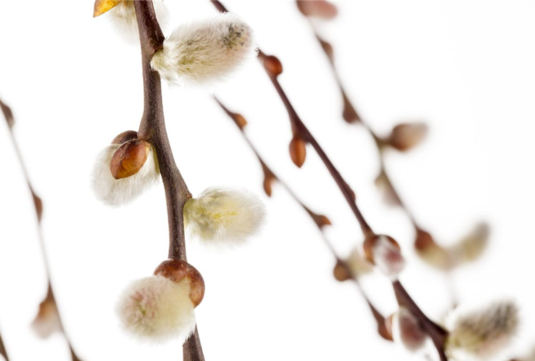 Die Kätzchen-Weide gehört auch zu den Frühlingsboten. Auch wenn ihre „Kätzchen“ eher plüschig und gut eingepackt aussehen, ist Ostern ziemlich nahe, wenn die Kätzchen-Weide blüht. Die Kätzchen-Weide hat zwei Gesichter: einzelne Pflanzen tragen entweder nur männliche oder nur weibliche Weidekätzchen. Die männlichen Blütenstände sind in der Regel größer und sind über und über mit gelben Staubgefäßen bedeckt. Die weiblichen Weidekätzchen sind silbergrau.