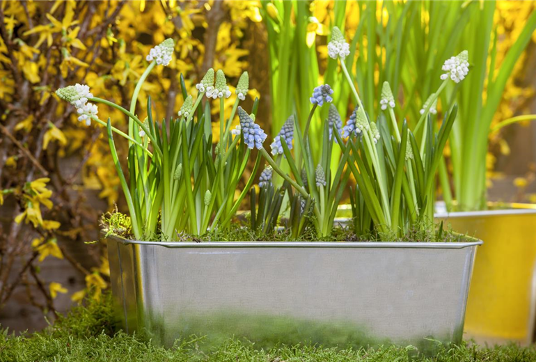 Sonnenschein und blauer Himmel, wenn man aus der Balkontür tritt? Keine rutschigen Stellen, kein Matsch? Ja, es wird Frühling auf dem Balkon! Kästen, Töpfe und Ampeln warten auf pflanzlichen Inhalt. Vor den Eisheiligen konzentriert man sich auf frostharte Pflanzen. Trotzdem deckt man die botanischen Lieblinge im Zweifelsfall lieber ab. Der Frühling auf dem Balkon beginnt mit einer geschickten Etagen-Konstruktion. Zuunterst im Pflanzgefäß warten die Zwiebeln von Traubenhyazinthen aufs Gedeihen, gern begleitet von gelben Narzissen. Im nächsten Stockwerk folgen Tulpen, und im letzten die zauberhaften Schneeglöckchen. Wer es bunt mag, ergänzt sie mit farbigen Krokussen.