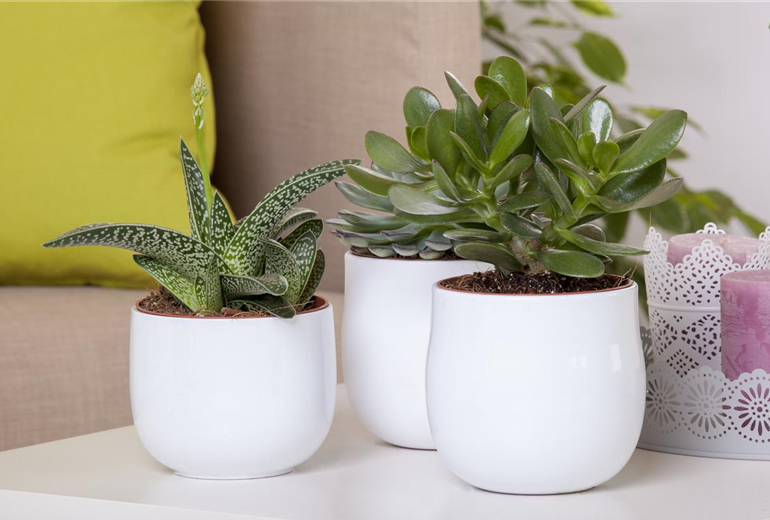 Die Blattrosette können Sie dagegen das ganze Jahr über als Pflanzschmuck genießen – plus als Schönheits- und Heilmittel: Einfach eines der fleischigen Blätter kappen und mit der Schnittstelle die Haut betupfen oder mit einem Messer das Gel des Blatts herausdrücken und auftragen. So eine SOS-Maßnahme hilft bei Insektenstichen, Herpes, Schnitt- und Schürfwunden, Sonnenbrand und anderen Verbrennungen. Sie können Aloe vera aber auch kurmäßig anwenden, bei Akne, trockener, empfindlicher oder unreiner Haut. Zum Beispiel mit einer Maske, die Sie einmal wöchentlich zehn Minuten einziehen lassen. Dazu ein Blatt von der Außenhaut befreien, durchpassieren, den Saft mit einem Teelöffel Quark und Honig verrühren, fertig! Oder das Gel pur auftragen, kurz antrocknen lassen und dann abspülen. Diese Treatments lindern Reizungen, hemmen Entzündungen, befeuchten und beruhigen, glätten und pflegen den Teint: Ihr eigenes Home-Spa – mit dem Beautyelixier aus dem Blumentopf!