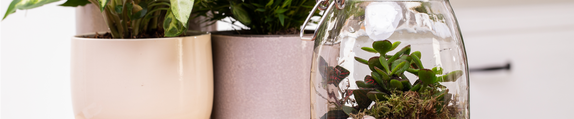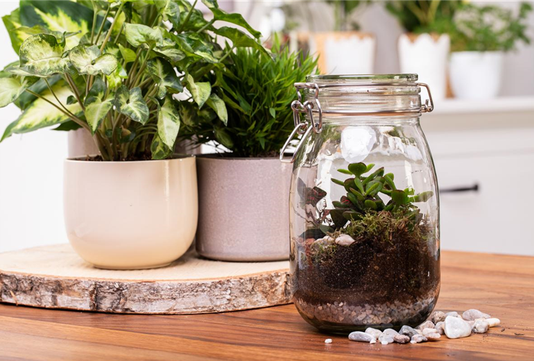 Ein Mal gegossen ist so ein kleines Biotop im Glas ein richtiger Selbstläufer. Und in diesem kleinen Biotop lassen sich viele schöne Pflanzen halten. Dafür benötigt man lediglich ein Bügelglas, Kies, Pflanzen, Erde und Dekoelemente.